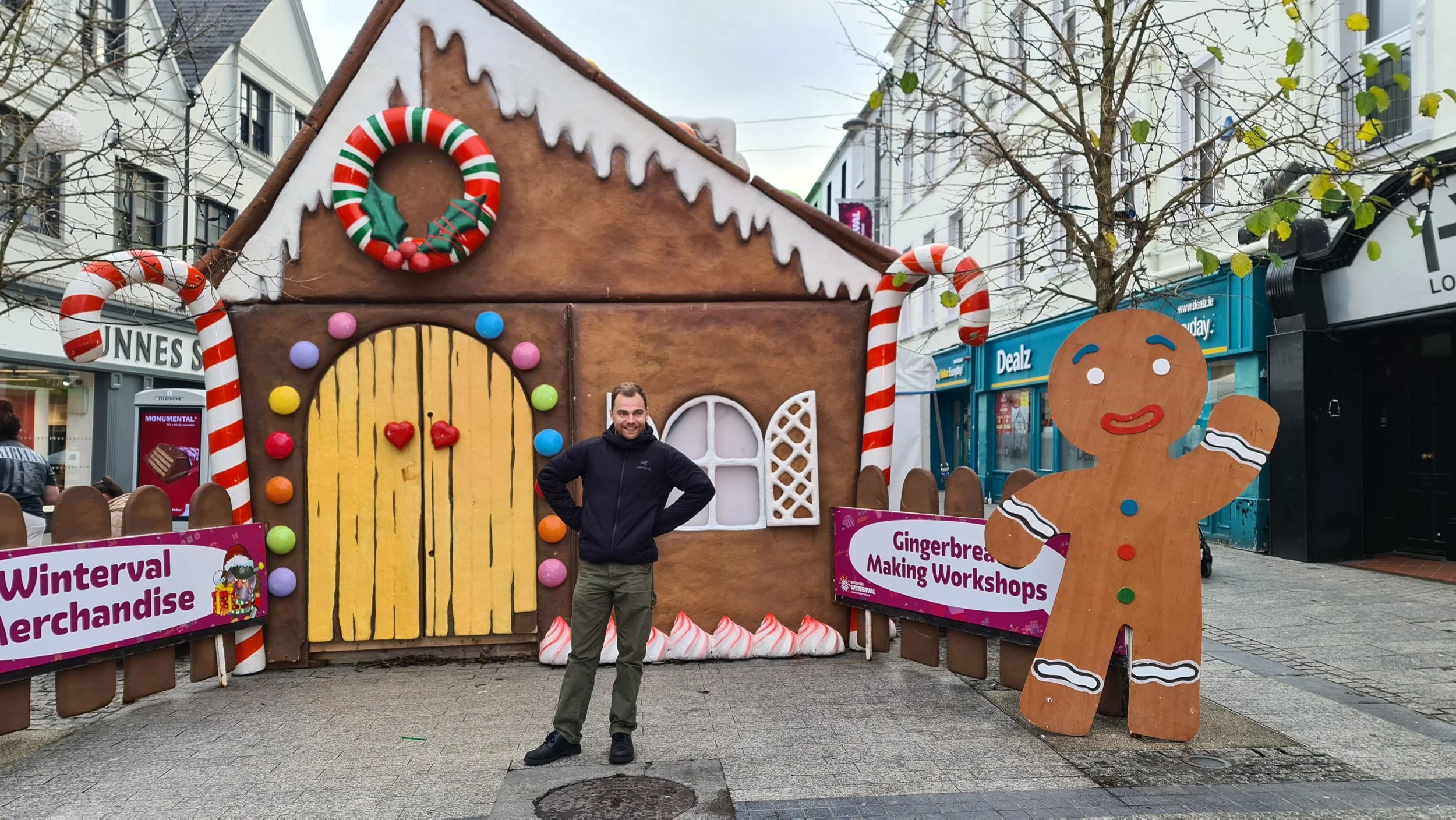 Mr. Schulte-Vorwick showing off a ginger bread house in Waterford during a trip for the IFI Film Festival