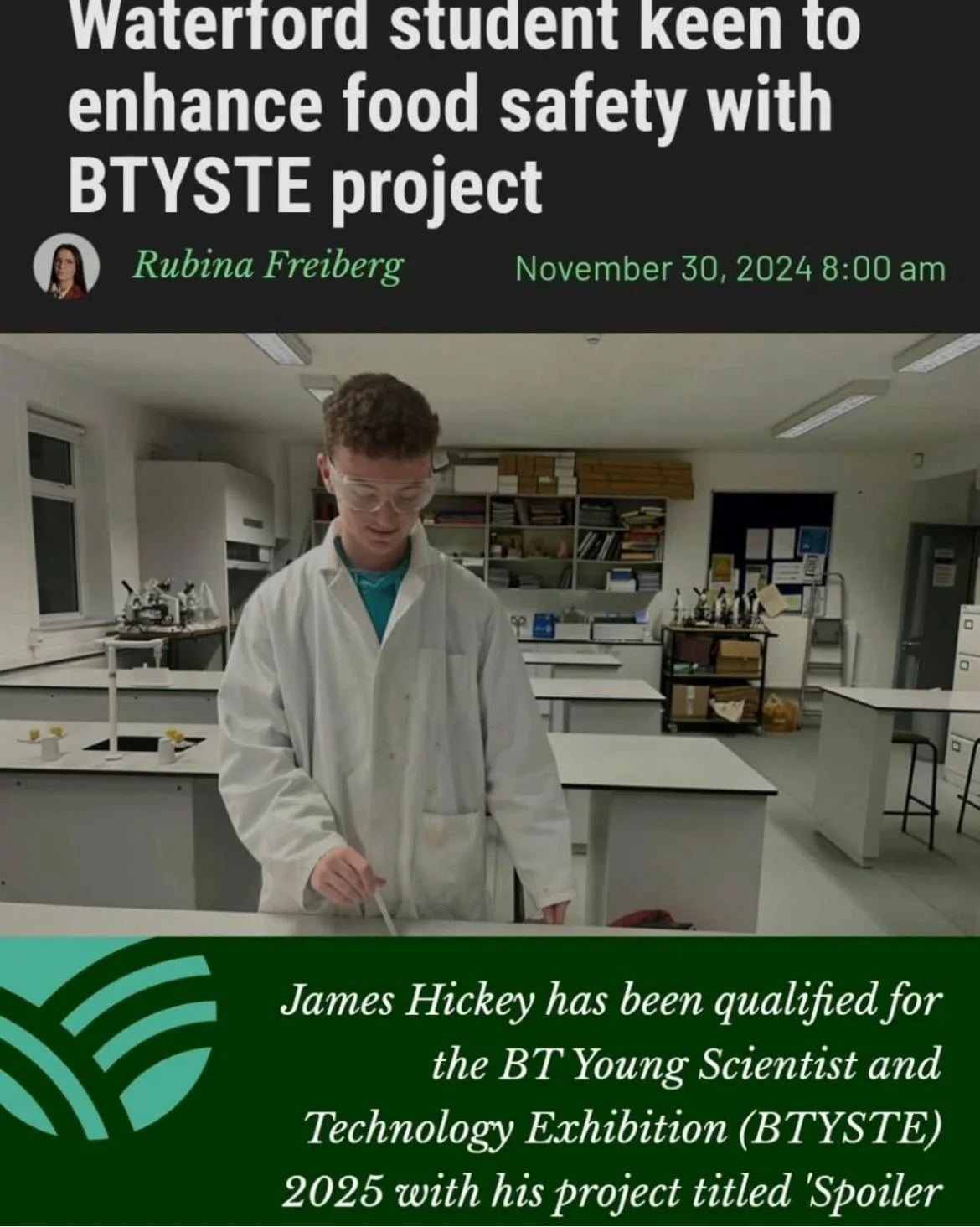 We are delighted to share some fantastic news – Congratulations to James Hickey, who won the Food Safety Authority of Ireland Award for his project. This is a wonderful achievement and a testament to his hard work, creativity, and scientific curiosity.